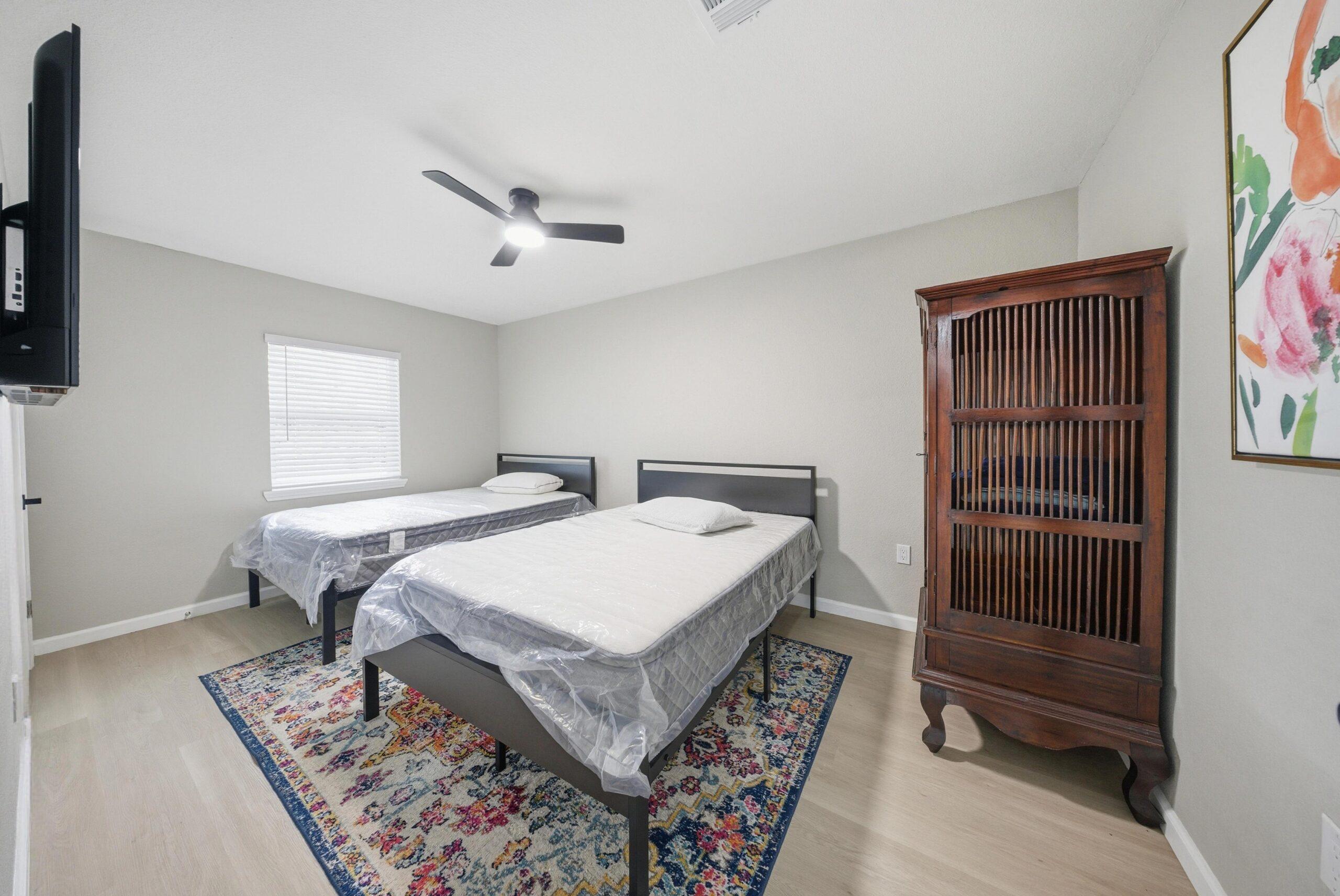 - 2 full beds per room